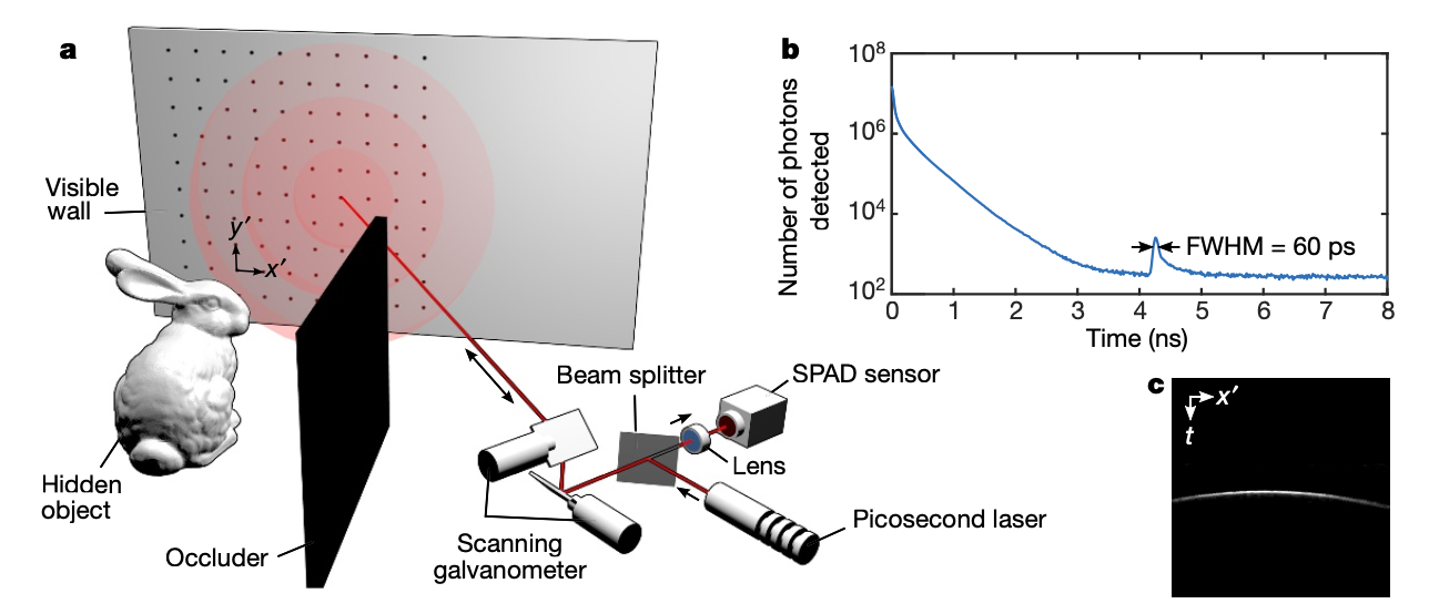 为藏在摄像机视域外的物品成像,是一个在很多研究领域非常重要且基础的问题。在很多领域都有应用潜力如机器人视觉、防御、遥感、自动驾驶等。宏观来讲,非视域成像(NLOS)可以用脉冲激光和时间分辨探测器扫描一个可见的表面得到测量数据。光探测与测距(LIDAR)系统利用此类测量从直接反射中恢复可见物体的形状,而 NLOS 成像是从多次散射的光中重建隐藏物体的形状和反照率。尽管近期取得了进展,但由于现有重建算法高昂的内存和处理需求,以及多次散射光信号极其微弱,NLOS 成像仍然不切实际。