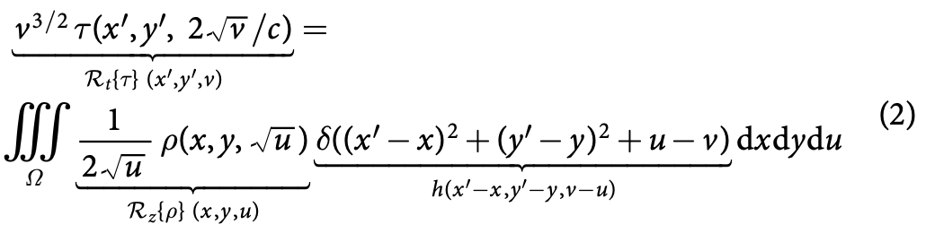 \tau(x’,y’,t)=\iiint_{\Omega} \frac{1}{r^4} \rho(x,y,z) \delta(2\sqrt{(x’-x)^2+(y’-y)^2}+z^2-tc)dxdydz\qquad(1)