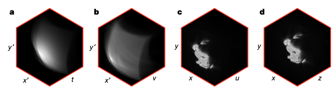 它的横轴是扫描位置 (x’),纵轴是时间 (t),图像亮度则代表光子数量。图中明亮的弧线轨迹,精确地捕捉了间接光传输的时空几何信息,这是重建算法赖以解码的核心数据。