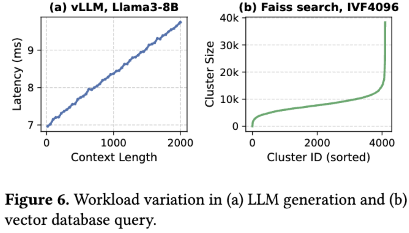 通过等长阶段划分来实现平衡流水线化并不简单,因为生成阶段和检索阶段的工作负载是不平衡的。为了更好地理解不平衡的来源,作者分析了最小可调度单元的延迟特性:生成阶段的解码步骤和检索阶段的单簇搜索,并提出了一种动态、负载感知的对齐策略,根据实时工作负载调整子阶段边界。
