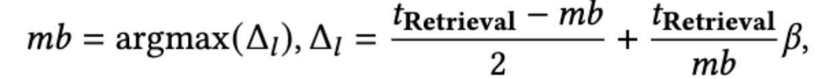 假设检索请求在所有子阶段中均匀到达,$\beta$ 表示请求调度和处理中间结果的 CPU 开销。$𝑡_{Retrieval}$ 表示检索阶段的平均时间,是在运行时测量的。