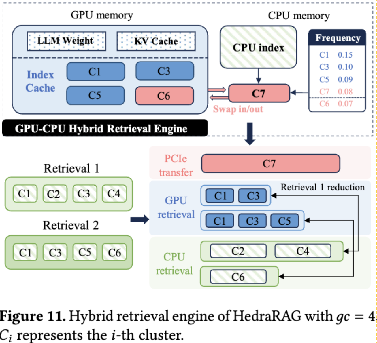 但是 LLM 推理消耗了大部分 GPU 内存,GPU 必须在需要时从 CPU 内存加载索引片段,这受限于PCIe的有限带宽。