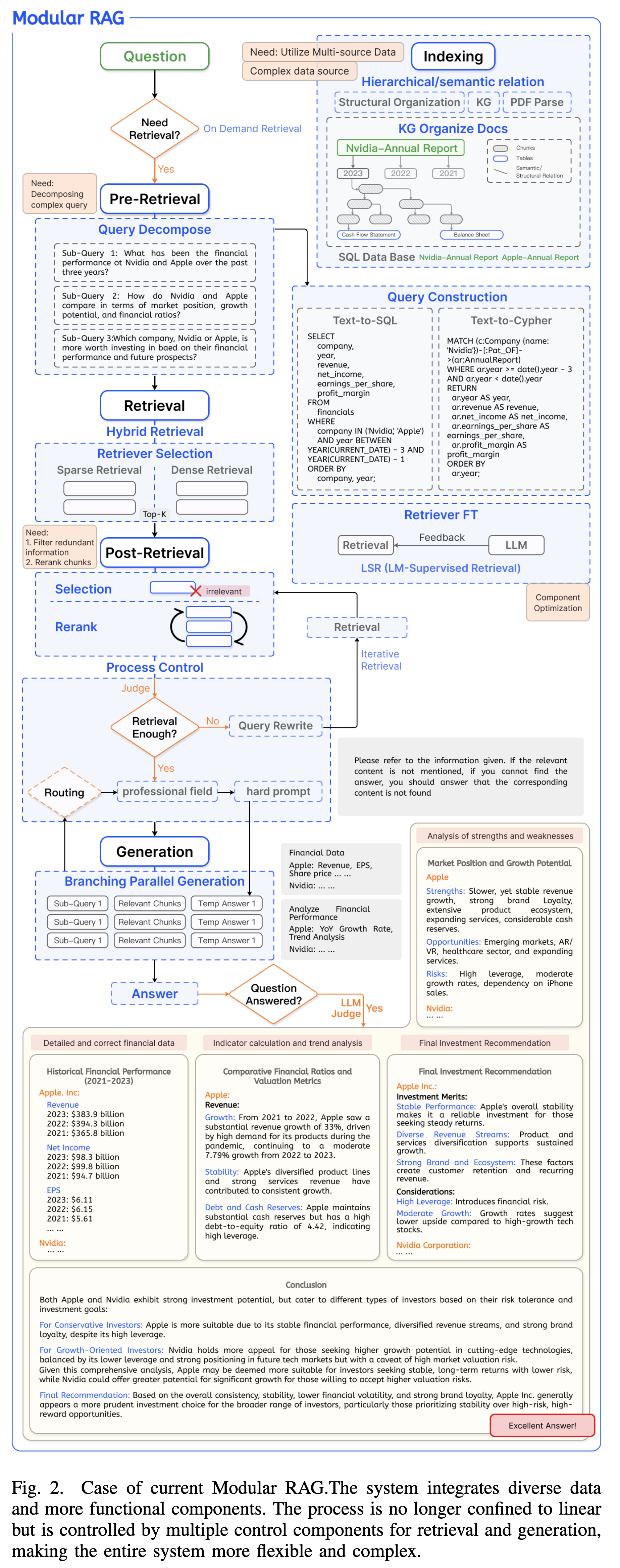 - 典型流程:Pre-retrieval $\to$ Retrieval $\to$ Post-retrieval $\to$ Generation。
