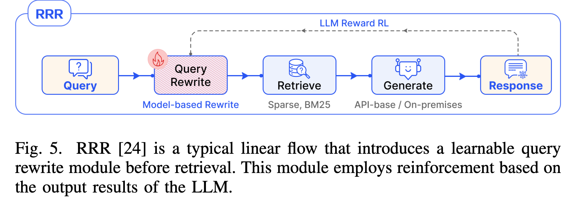 - RRR (Rewrite-Retrieve-Read): 在检索前引入一个可训练的 Query Rewrite 模块,利用强化学习优化重写策略,后续接标准的 BM25 检索和生成。