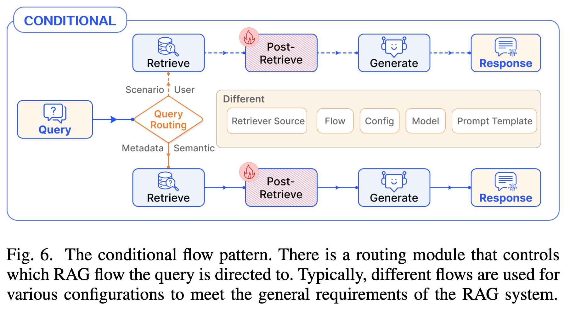 - 机制:引入 Routing (路由) 模块,根据 Query 的类型或语义选择不同的执行路径。