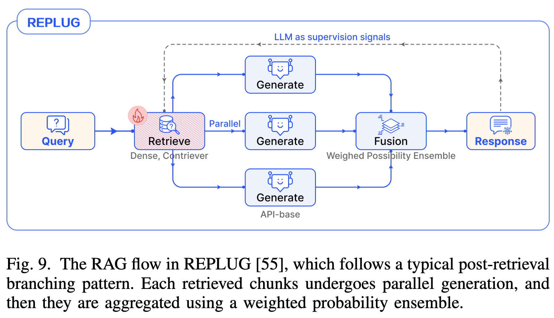 - 案例:REPLUG 对每个检索到的文档计算生成概率,通过加权集成(Weighted Ensemble)得出最终答案,并利用该信号监督检索器的更新。
