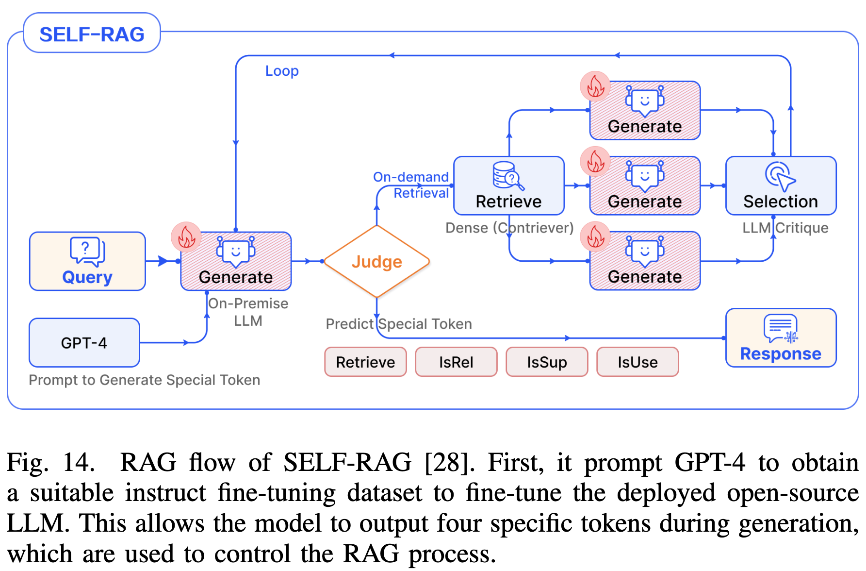 - Self-RAG:训练 LLM 生成特殊的 Reflection Tokens (如