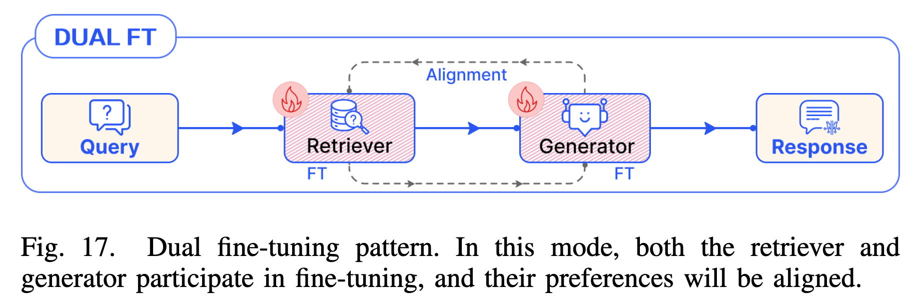 - Dual FT:同时微调检索器和生成器(如 RA-DIT),使两者的偏好对齐(Alignment)。