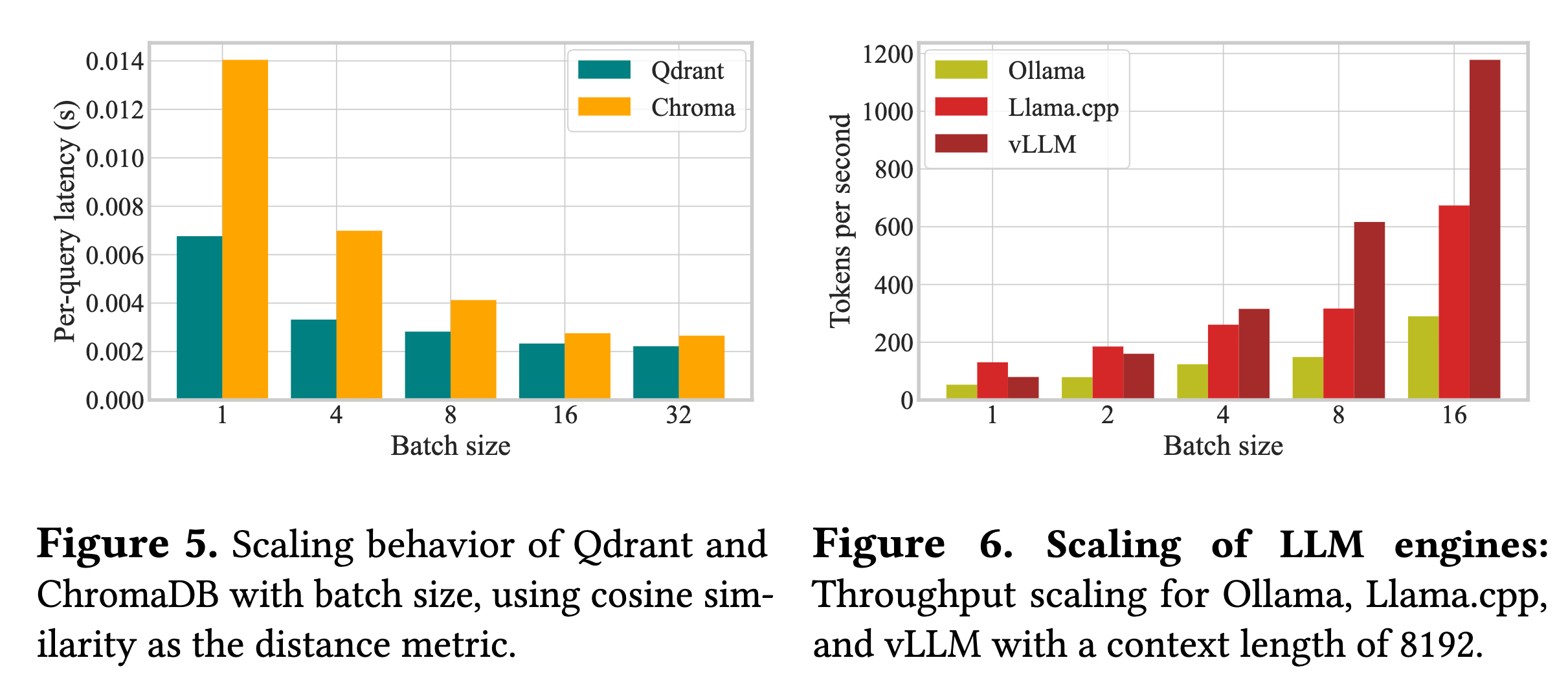 - 扩展行为异构:不同组件的延迟随负载(Batch Size)或数据量变化的曲线截然不同。例如,Qdrant 数据库的查询延迟随文档数量增加而显著上升,而 ChromaDB 则相对平稳;vLLM 的吞吐量随 Batch Size 的扩展性优于 Ollama。