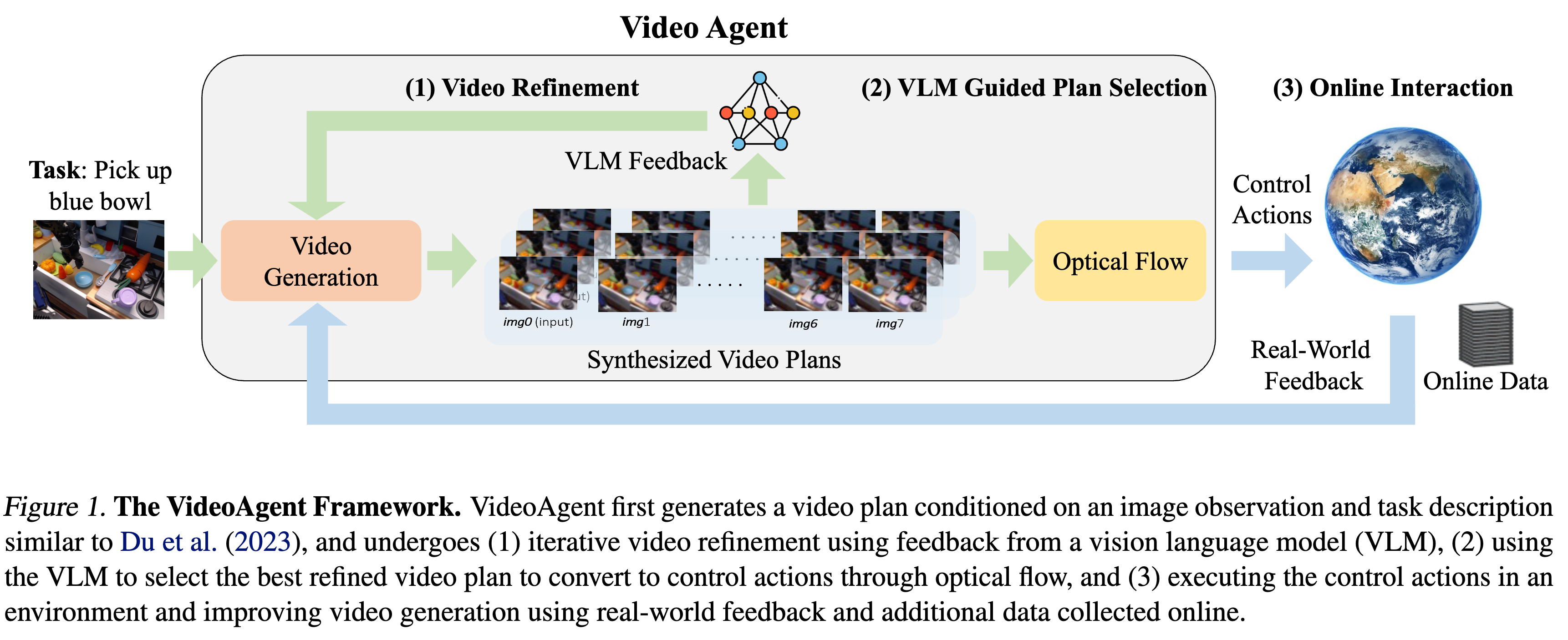 视频生成已被用于生成控制机器人系统的视觉计划(Visual Plans)。通常的做法是给定图像观测和语言指令,生成视频计划,然后将其转换为机器人控制指令并执行。然而,利用视频生成进行控制的一个主要瓶颈在于生成视频的质量,这些视频往往存在内容幻觉(Hallucinatory content)和不切实际的物理现象,导致从中提取控制动作时任务成功率低下。 虽然扩大数据集和模型规模是一个部分解决方案,但整合外部反馈对于将视频生成落地到物理世界既自然又至关重要。基于这一观察,我们提出了 VideoAgent,用于基于外部反馈自我改进生成的视频计划。VideoAgent 并不直接执行生成的视频计划,而是首先利用一种称为 自我调节一致性(Self-Conditioning Consistency) 的新颖程序来优化生成的视频计划,从而将推理时的计算量(Inference-time compute)转化为更好的生成质量。随着优化后的视频计划被执行,VideoAgent 还能从环境中收集额外数据,以进一步改进视频生成。在 MetaWorld 和 iTHOR 的模拟机器人操作实验中,VideoAgent 大幅减少了幻觉,从而提高了下游操作任务的成功率。我们进一步展示了 VideoAgent 可以有效优化真实机器人的视频,提供了机器人可以作为将视频生成落地物理世界的有效工具的早期证据。
